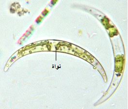 - هلالي الشكل.يحتوي على منطقتين شفافيتين في بداية الطحلب ونهايته.