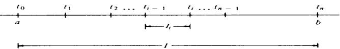 Let f be a bounded function whose domain is a closed interval I ={x : a ≤ x ≤ b}. We subdivide I by introducing points t1,t2,...,tn−1 that are interior to I. Setting a = t0 and b =tn and ordering the points so that t0 < t1 <t2 <...<tn, we denote by I1,I2,...,In the intervals Ii ={x : ti−1 ≤ x ≤ ti}. Two successive intervals have exactly one point in common. (See Figure 1.1.) We call such a decomposition of I into subintervals a subdivision of I, and we use the symbol Δ to indicate such a subdivision. Since f is bounded on I, it has a least upper bound (l.u.b.), denoted by M. The greatest lower bound (g.l.b.) of f on I is denoted by m. Similarly, Mi and mi denote the l.u.b. and g.l.b., respectively, of f on Ii . The length of the interval Ii is ti − ti−1; it is denoted by l(Ii).