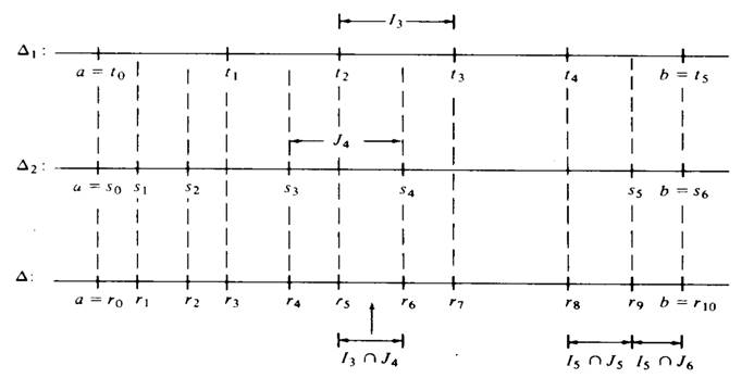 Suppose that Δ1 with subintervals I1,I2,...,In and that Δ2 with subintervals J1,J2,...,Jm are two subdivisions of an interval I. Wegetanew subdivision of I by taking all then dpoints of the subintervals of bothΔ1 and Δ2, arranging them in order of increasing size, and then labeling each subinterval having as its endpoints two successive subdivision points. Such a subdivision is called the common refinement ofΔ1 and Δ2, and each subinterval of this new subdivision is of the form Ii ∩ Jk, i = 1, 2,...,n, k = 1, 2,...,m. Each Ii ∩ Jk is either empty or entirely contained in a unique subinterval (Ii) of Δi and a unique subinterval (Jk) of Δ2. An illustration of such a common refinement is exhibited in Figure