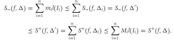 (b) If Δ/is a refinement of Δ, then S−(f,Δ) ≤ S−(f,Δ/) ≤ S+(f,Δ/) ≤ S+(f, Δ).