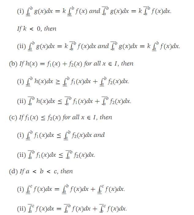 The next theorem states simple facts about upper and lower Darboux integrals. The results all follow from the definitionsof inf, sup, and upper Darboux and lower Darboux integrals.