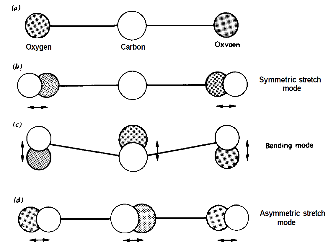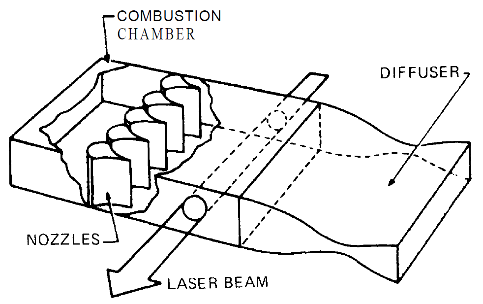 The most important example is provided by the CO2 gas laser. In these molecules the individual atoms can perform oscillations. The three fundamental kinds of oscillations are shown in fig. 1.1. According to quantum theory the different kinds of oscillations must be quantized so that discrete energy levels result. The energy level diagram belonging to some low lying oscillation levels of CO2 is represented in fig. 1.2. One of the laser processes rests on the optical transition between the levels which are denoted in fig. 1.2 by 00'1 and 10'0. The excitation of the uppermost level is usually achieved in a plasma discharge in which N2 and He participate in addition to CO2. In the plasma discharge a large fraction of the two-atomic N2 molecules is excited to make vibrations, whereby the molecules accumulate in the excited state with the vibration quantum number n = 1 of the harmonic oscillator. Collisions with CO2 molecules in their ground states make a transfer of the energy from the excited state of N2 to an excited state of CO2 possible. The remaining small energy difference is transformed into kinetic energy of the molecules after their collisions. The efficiency of CO2 lasers is very high and lies at about 30%. In order to achieve high power emission, lasers with a length up to several hundred meters have been built. According to quantum theory, besides the vibrational levels of CO2 molecules also discrete rotational levels are possible which may also participate in the laser process. If the gas pressure is increased above 5 Torr, due to the numerous collisions a line-broadening occurs which exceeds the usual