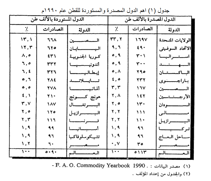 القطن من المحاصيل الزراعية التي تشارك بنسبة كبيرة في التجارة الدولية، حيث يشارك نحو ثلث الإنتاج في التجارة الدولية كما يبدو من (جدول 1) وكان القطن يساهم بنسبة اكير من مساهمته الحالية من قبل، وذلك لان كثيرا من الدول المنتجة بدأت في تصنيعه محليا كما تزايدت المنافسة على الالياف الصناعية ولذلك انخفضت صادراتها، كما هو الحال بالنسبة لمصر التي انخفضت صادراتها الى النصف خلال الفترة من 1960م الى 1975م، ثم انخفضت بدرجة اكبر في السنوات الأخيرة.