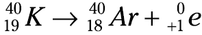 The K-40 emits the positron, leaving an element with a mass number of 40 (40 – 0) and an atomic number of 18 (19 – 1). An isotope of argon (Ar), Ar-40, has been formed.