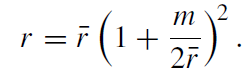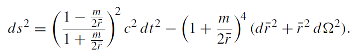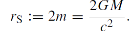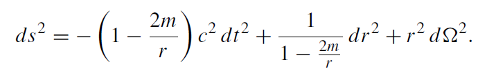 This is the Schwarzschild (or gravitational) radius. In this chapter, we distinguish between m and M. In subsequent chapters, it is generally assumed that c = 1 = G. Then, we have m = M. At the Schwarzschild radius rS the metric coefficients become singular. However, this is only a so-called coordinate singularity since the curvature tensor (and therewith physically meaningful quantities like the tidal force) remains finite. We can also see this explicitly when we introduce suitable coordinates, like isotropic coordinates. Therefore we define a new radial coordinate . r as follows: