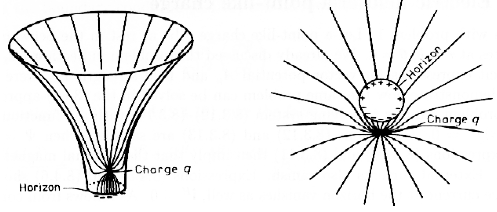 It is easy to see that at the horizon Eθ → 0 so that electric lines of force intersect the horizon at right angles. The total flux of E across the horizon is zero (the black hole is uncharged). The pattern of electric lines of force is shown in figure 1.1.