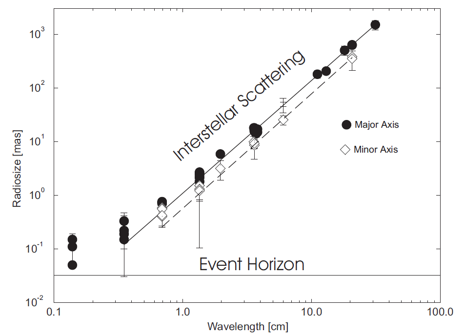 It was, however, quickly realized that, despite its relative proximity, detecting the true structure of Sgr A* is unusually difficult compared to other galactic nuclei. The reason is that interstellar material in the line of sight towards the Galactic Center scatter broadens the VLBI image. This produces a characteristic λ2 law (e.g. Scheuer 1968) for the size of Sgr A* as a function of the wavelength λ (Davies et al 1976, van Langevelde et al 1992, Yusef-Zadeh et al 1994, Lo et al 1998). The scattering size apparently has not changed over a decade (Marcaide et