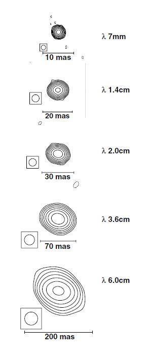 Figure 1.2. Contour plots of VLBA images of Sgr A* at wavelengths of λ = 6.0, 3.6, 2.0, 1.35, and 0.7 cm. These images are smoothed to a circular beam of FWHM = 2.62λ1.5cm mas as shown at the bottom left-hand corner on each image. The contours are 2 mJy beam−1 × (−2, 2, 4, 8, 16, 32, 64, 128, 256). Figure from Lo et al (1999).