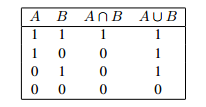 Here, an entry 1 means that x is in the set pointed to by the column head, and 0 tells us that it is not.