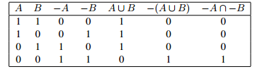 With these three tables we can find the table for every set which is formed from A and B by the operations ∩, ∪, and −. Let us look at the table for the first De Morgan rule: