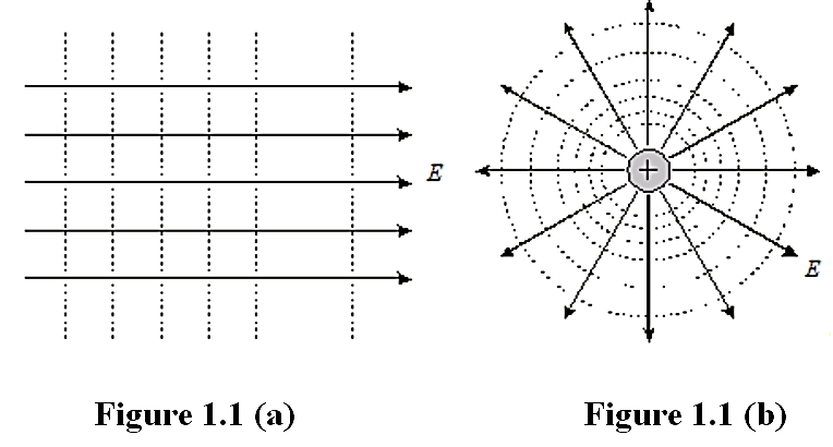 Figure 1.1 shows the equipotential surfaces (dashed lines) and the electric field lines (bold lines), (a) for uniform electric field and (b) for electric field due to a positive charge.