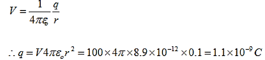 What must the magnitude of an isolated positive charge be for the electric potential at 10 cm from the charge to be +100V?