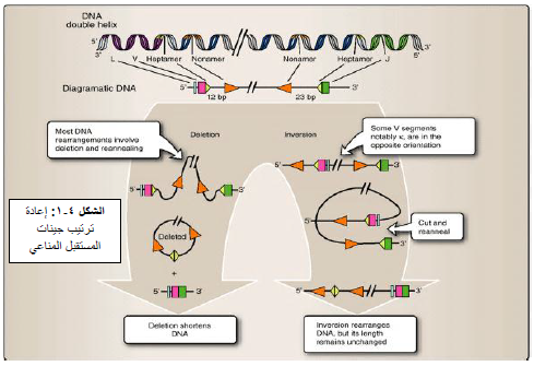 عملية إعادة ترتيب الجينات هي المسؤولة عن التنوع الكبير في مناطق الارتباط بالمستضد لمستقبلات الخلايا التائية والبائية ، حيث يتم إعادة ترتيب ودمج أجزاء جينية موجودة في الأصل في الكروموسوم منفصلة عن بعضها وتتم هذه العملية بحذف بعض الجينات وقلب بعضها الآخر ومن ثم دمج المتبقي في جين واحد يشفر للتسلسلات الببتيدية في منطقة الارتباط بالمستضد لمستقبل الخلية التائية أو البائية [الشكل 4-1] .