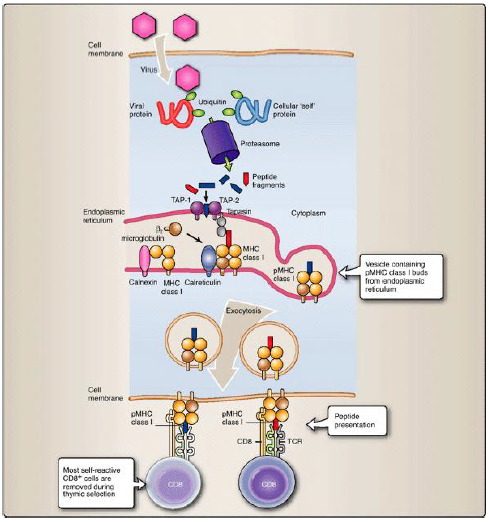 الشكل2 : يتم بصورة دائمة عرض المستضدات الداخل خلوية intracellular or cytoplasmic antigens سواء كانت مستضدات ذاتية (بروتينات الجسم الطبيعية) [يمين] ، أو كانت مستضدات غريبة (عائدة إلى ميكروبات خلوية) [يسار] مرتبطة بـ MHC I للخلايا التائية السامة للخلايا CTLs، حيث يتم تحطيم البروتينات الموجودة في السيتوبلازما سواء كانت بروتينات ذاتية أو ميكروبية بواسطة المعقد الأنزيمي Proteasome إل أجزاء ببتيدية صغيرة ومن ثم تنقل تلك الأجزاء الببتيدية إلى الشبكة الإندوبلازمية لترتبط بجزيئات MHC I المنتجة حديثا وتقحم في غشاء الخلية لتتعرف عليها خلايا CTLs .