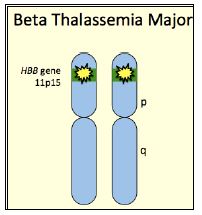 فقر دم البحر المتوسط ومنها جاءت التسمية اذ ان Thalassa تعني البحر وHaema تعني الدم وهو اضطراب في الدم يؤدي الى قلة انتاج الهيموغلوبين الذي يرتبط بالحديد في خلايا الدم الحمر الذي يحمل الاوكسجين للجسم ، لذا يقل الاخير في عدد من اعضاء الجسم ، ويكون هناك ايضا قلة في عدد خلايا الدم الحمرAnemia تؤدي الى شحوب البشرة والضعف والاعياء وتعقيدات كثيرة ويحصل للمرضى تجلط دم غير طبيعي ، وعمر خلايا الدم الحمر حوالي 4 اشهر وكل يوم يقوم الجسم بانتاج خلايا جديدة للتعويض عن الخلايا الميتة او التي فقدت من الجسم ، اما في حالة المرض فان خلايا الدم الحمر تدمر بسرعة مسببة فقر الدم . يقسم الاضطراب الى نوعين اعتمادا على شدة المرض Major وتعرف ب Cooley's Anemia وهي الاشد وتظهر اعراضها في عمر سنتين ويتطور لديهم فقر دم يهدد الحياة ، ويكون النمو متعثرا ولا يزداد الوزن ، ويمكن ان يحصل اليرقان وتضخم الطحال والكبد والقلب ويحصل بعض الاحيان تشوه في العظام ، ويحتاجون الى نقل الدم للتعويض عن كريات الدم الحمر . اما الحالة المتوسطة Intermedia تظهر في مرحلة الطفولة المتاخرة او متاخرة من الحياة ويكون فقر لدم معتدل ولكن النمو يكون بطيئا وحصول تشوه بالعظام ، وهناك حالة خفيفة Minor . شيوع المرض حوالي 100000:1.