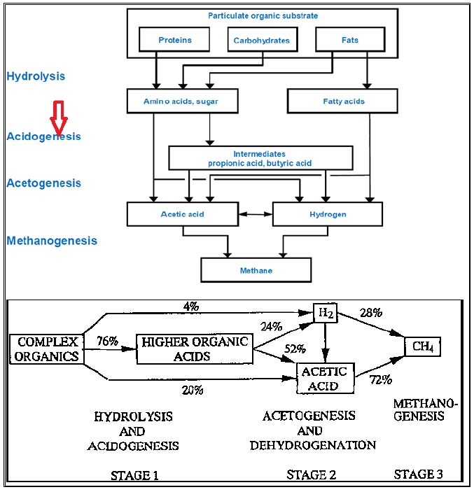 الاحياء المولدة للحوامض العضوية عادة ، مثل انتاج الحوامض العضوية من السكريات القابلة للتخمر وغيرها من المركبات ، وهي تشكل جزءا رئيسا من الفلورا المولدة للميثان ، كما في التفاعلات الاتية :