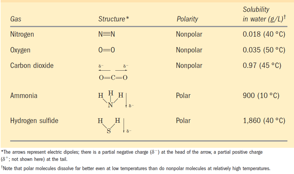 When water is mixed with benzene or hexane, two phases form; neither liquid is soluble in the other. Nonpolar compounds such as benzene and hexane are hydrophobic—they are unable to undergo energetically favorable interactions with water molecules, and they interfere with the hydrogen bonding among water molecules. All molecules or ions in aqueous solution interfere with the hydrogen bonding of some water molecules in their immediate vicinity, but polar or charged solutes (such as NaCl) compensate for lost water-water hydrogen bonds by forming new solute-water interactions. The net change in enthalpy (ΔH) for dissolving these solutes is generally small. Hydrophobic solutes, however, offer no such compensation, and their addition to water may therefore result in a small gain of enthalpy; the breaking of hydrogen bonds between water molecules takes up energy from the system. Furthermore, dissolving hydrophobic compounds in water produces a measurable decrease in entropy. Water molecules in the immediate vicinity of a nonpolar solute are constrained in their possible orientations as they form a highly ordered cagelike shell around each solute molecule. These water molecules are not as highly oriented as those in clathrates, crystalline compounds of nonpolar solutes and water, but the effect is the same in both cases: the ordering of water molecules reduces entropy. The number of ordered water molecules, and therefore the magnitude of the entropy decrease, is proportional to the surface area of the hydrophobic solute enclosed within the cage of water molecules. The free energy change for dissolving a nonpolar solute in water is thus unfavorable: ΔG = ΔH - T ΔS, where ΔH has a positive value, ΔS has a negative value, and ΔG is positive. Amphipathic compounds contain regions that are polar (or charged) and regions that are nonpolar. When an amphipathic compound is mixed with water, the polar, hydrophilic region interacts favorably with the solvent and tends to dissolve, but the nonpolar, hydrophobic region tends to avoid contact with the water (Fig. 1.1a).