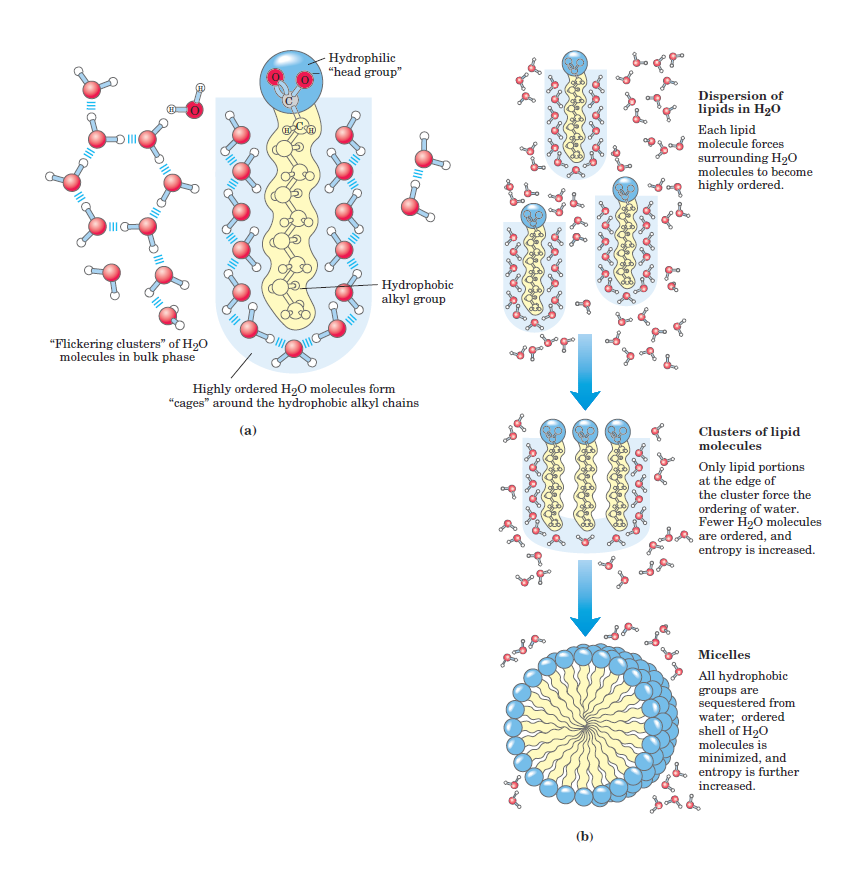 FIGURE 1.1 Amphipathic compounds in aqueous solution. (a) Longchain fatty acids have very hydrophobic alkyl chains, each of which is surrounded by a layer of highly ordered water molecules. (b) By clustering together in micelles, the fatty acid molecules expose the smallest possible hydrophobic surface area to the water, and fewer water molecules are required in the shell of ordered water. The energy gained by freeing immobilized water molecules stabilizes the micelle.