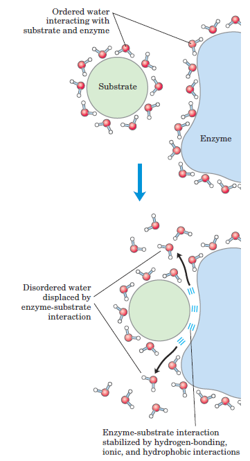 Part of the driving force for binding of a polar substrate (reactant) to the complementary polar surface of an enzyme is the entropy increase as the enzyme displaces ordered water from the substrate (Fig. 1.2).