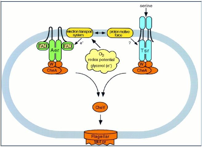 فقد وجد في البكتريا Azospirillum brasilense التي تستعمل الأوكسجين كمستلم نهائي للألكترونات في حالة التنفس وهي في واقع الحال Microaerophilic ولوصول الخلايا إلى التركيز المطلوب من الأوكسجين (5-3 مايكرومول) تتحفز الخلايا تحت تاثير ظاهرة الانجذاب للهواء فعندما تتحرك الخلايا تجاه الأوكسجين تزيد من القوة الدافعة للبروتونات (pmf) ثم تقل هذه القوة عند تحرك الخلايا بعيداً عن الشد العالي للأوكسجين ومن هذا يبدو أن القوة الدافعة للبروتونات هي التي تقوم بعمليات تنظيم ظاهرة الانجذاب للهواء.