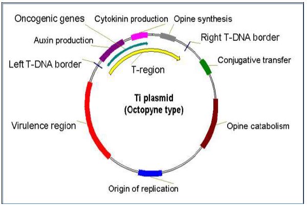 وتعود امراضيتها إلى احتوائها على بلازميد كبيروهو (Ti – Plasmid (Tumor Inducing Plasmid ، بلازميد كبير يصل حجمه إلى 200 كيلو قاعدة يحوي العديد من الجينات ، البعض مسئول عن عملية الإصابة والأخرى مسئولة عن التعرف على المضيف، والمنطقة المسئولة عن الإصابة تتمثل بقطعة يطلق عليها T- DNA يصل حجمها إلى 15-30 كيلو قاعدة لها القابلية على الاندماج مع كروموسوم الخلايا النباتية وتحمل القطعة حوالي 8 جينات أو أكثر التي تكون مسئولة عن عملية التكاثر السرطاني في الخلايا النباتية، وكذلك مسئولة عن تخليق مواد غير طبيعية يطلق عليها Opines التي تستعمل كمواد غذائية من قبل البكتريا وعند اندماج القطعة مع كروموسوم الخلايا النباتية تبقى ثابتة وتنتقل من جيل لأخر وتتضاعف كجزء من كروموسوماتها ، ويمكن ان يستغل البلازميد وخاصة القطعة T-DNA لدس الجينات المرغوبة إلى الخلايا النباتية، ويتم التغلب على عرقلة كبر حجم البلازميد Ti بأنه تحمل القطعة T – DNAعلى بلازميد صغير وتكوين النظام المنشطر .