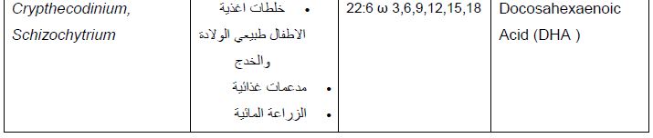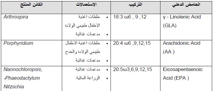 والمستعمل في أغذية الأطفال هو مستخلص الطحلب Crypthecodinium cohnii التي تحوي دهونها على 40 – 50% من DHA ولكن لا تحوي على EPA او غيرها من الحوامض الدهنية طويلة السلسلة ، وقد أجيز استعمالها في اكثر من 60 دولة من قبل منظمة FDA . وينتج الحامض DHA من الطحلب Schizochytrium على النطاق التجاري لأنه اقل كلفة في الانتاج وأطلق على المنتج DHA Gold ويستعمل كمدعمات في أغذية الصغار والكبار كما في استعماله في الأغذية الصحية والمشروبات الغازية ويستعمل ايضا في العلف الحيواني . ومن الأغذية المحضرة والحاوية عليه الاجبان واللبن والتلبيسات ومستحضرات الفطور من الحبوب . كما تحضر منه اغذية خاصة بالحوامل والمرضعات . ويستعمل الطحلب Ulkenia spp مــــــــــــــــــــن قـــــــــــــــــبل بعض الشركات ويسوق تحت مسمى DHA Active. امــــــــــــــــــا الحامض GLA)γ – Linolenic Acid ) فلا توجد مستحضرات تجارية خاصة به .