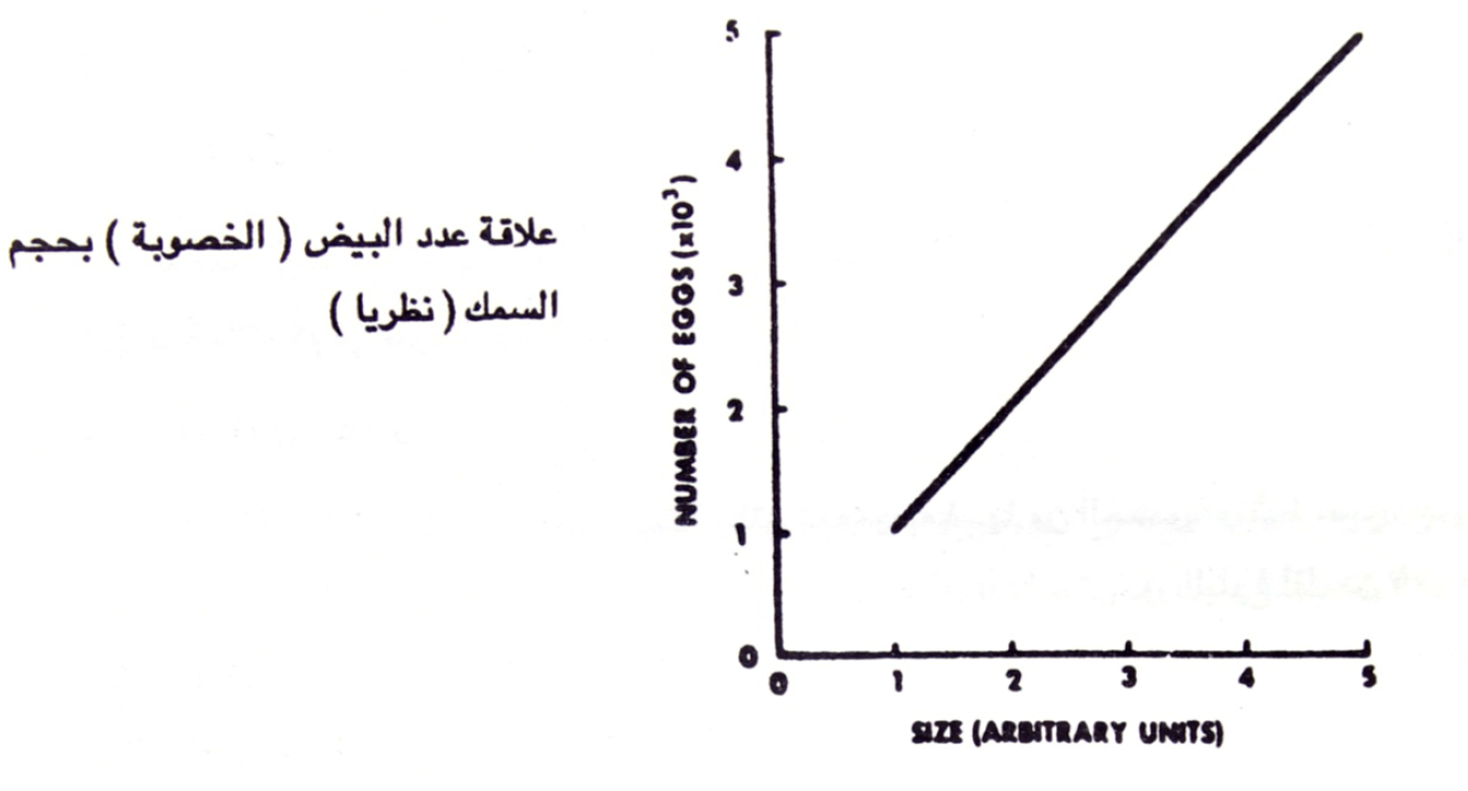حيث F الخصوبة، L طول السمك. كما يؤثر وزن السمك (W) على خصوبته (F) بعلاقة خطية كذلك: