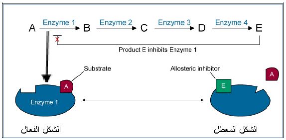 إحدى طرق السيطرة الأيضية التي تستعملها الأحياء المجهرية بشكل خاص لمنع عمليات فرط الإنتاج لنواتج الأيض التي تكتفي الخلايا منها ويطلق عليها التثبيط الرجعي أو تثبيط النواتج ويتم ذلك بواسطة مجموعة من الأنزيمات التي لها أكثر من موقع للتفاعل كما موضح في الشكل الآتي :