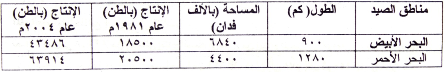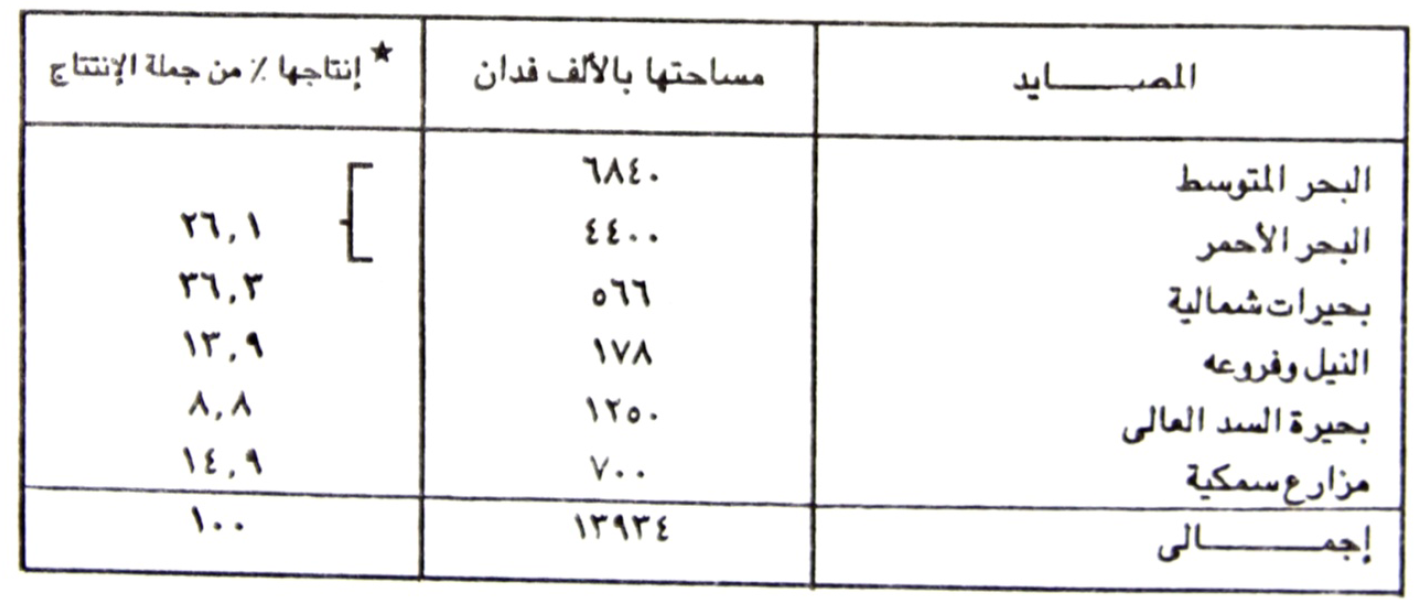 ومما سبق يتضح أن جملة المساحات الصالحة للصيد في مصر يزيد عن ضعف المساحة الزراعية النباتية فقد بلغت حوالى ۹۳،۱۳ مليون فدان بيانها كالتالي:
