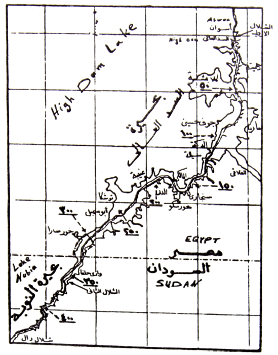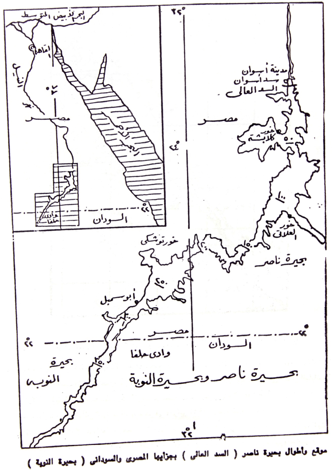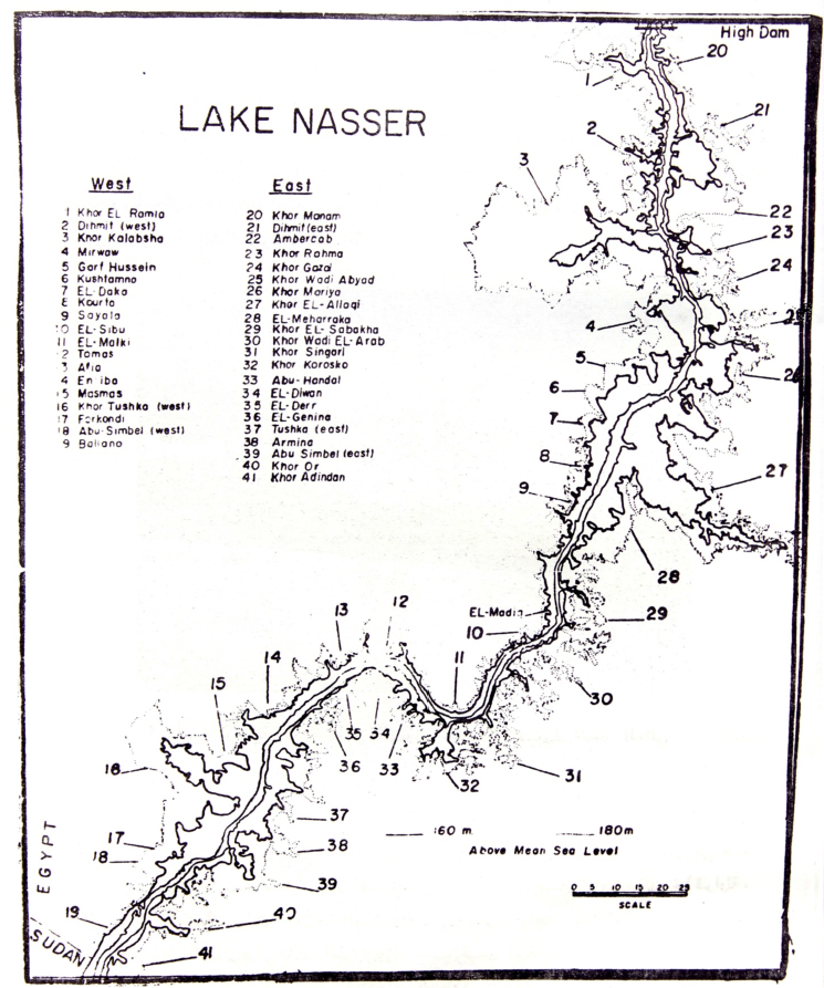 أطوال بحيرة السد العالي ( وبحيرة النوبة ) وموقع الخيران المختلفة