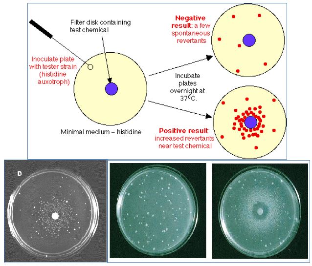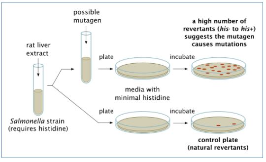 أحد الفحوص المهمة التي تستعمل في الكشف عن المواد المطفرة والتي يكون حوالي 85 % منها مواد مسرطنة، ويعتمد الفحص على استعمال سلالات خاصة من بكتريا Salmonella typhimurium التي تحتاج إلى الهستيدين وتوجد منها سلالات عدة كل منها قد حصل عطب في أحد جينات أوبرون الهستيدين ومثل هذه السلالات لا تستطيع العيش على الوسط الغذائي الأدنى إلا إذا أضيف لها الحامض الأميني الهستيدين ولكن بوجود بعض المطفرات يمكن أن تتغير الجينات المعطوبة وتعيدها إلى الحالة الطبيعية او حدوث طفرة ثانية تلغي الطفرة الاولى وبذلك تستطيع أن تنمو على الوسط الغذائي الأدنى أي تعود إلى طبيعة التغذية الأولية وتحوي السلالات المستعملة والتي تسمى سلالات ايمس بأسم الشخص الذي بدأ العمل بها في أوائل السبعينات (Bruce Ames) على طفرات أخرى مثل عدم إمكانيتها على إصلاح العطب المحث بالأشعة فوق البنفسجية كما أنها تحوي على بلازميدات تحمل المقاومة للأمبسلين ولا زالت الجهود مستمرة لتحسين هذه السلالات وجعلها تتحسس لأنواع مختلفة من المواد الكيمياوية المطفرة وبتراكيز قليلة. ويطبق الفحص كأحد شروط السلامة لمنتجات التخمر والمواد الصيدلانية وغيرها من المواد قبل طرحها للاستعمال ويسمى ايضا Mutatest .