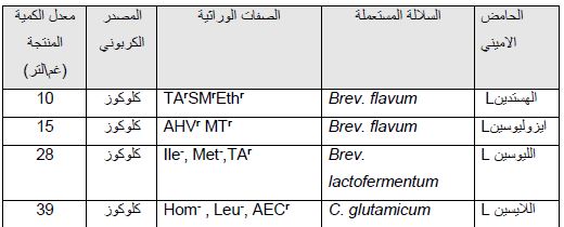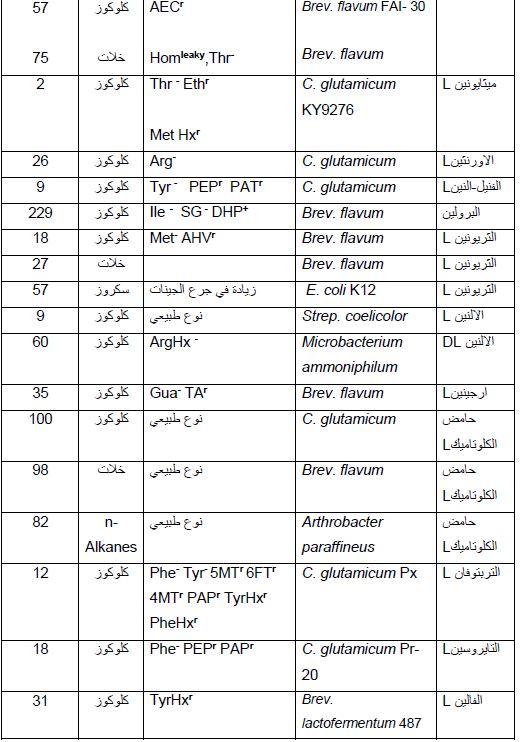 الاحياء التي يمكنها انتاج الحوامض الامينية ، وقد تكون هذه الاحياء طبيعية او من الاحياء المحورة التي تم التلاعب بشبكات السيطرة على تخليق الحوامض الامينية لتصبح ملائمة للانتاج وغير ملائمة للخلية المنتجة ، والجدول التالي يوضح بعض السلالات البكترية المحورة المستعملة للانتاج التجاري :