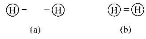 Figure 1.1 Representation of (a) hydrogen valence electrons and (b) covalent bonding in a hydrogen molecule.