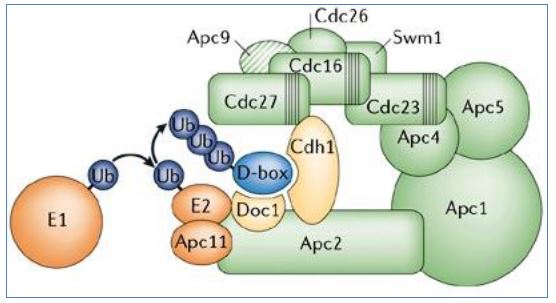 بروتين معقد يتكون من 11–13وحدة ثانوية ، يعرف ايضا Cyclosome او APC/C وهو Ubiquitin Ligase E3 الذي يعلم البروتينات من دورة الخلية لغرض تفكيكها في 26S Proteasome ، ويعد من الاساسيات لتنظيم دورة حياة الخلية ، فهو يعمل على انتقال الخلية من طور التقابلMetaphase الى طور الانفصال Anaphase باستهدافه تفكيك بعض البروتينات مثل Securin وS - Cycilns و M - Cycilns أي انه يقوم بعمليات طمغ هذه البروتينات Ubiquitination لتذهب الى مواقع التفكيك كما موضح في الشكل الاتي :