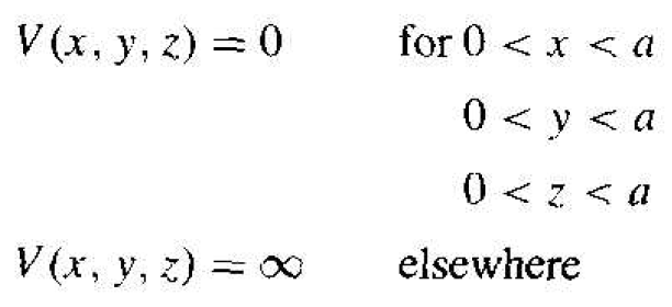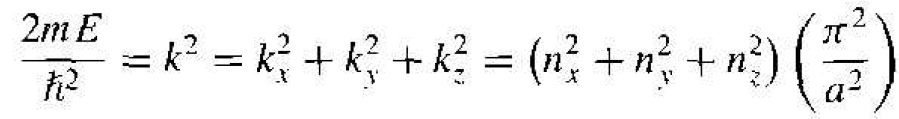 where the crystal is assumed to be a cube with length a. Schrodinger's wave equation in three dimensions can be solved using the separation of variables technique. Extrapolating the results from the one-dimensional infinite potential well, we can show that