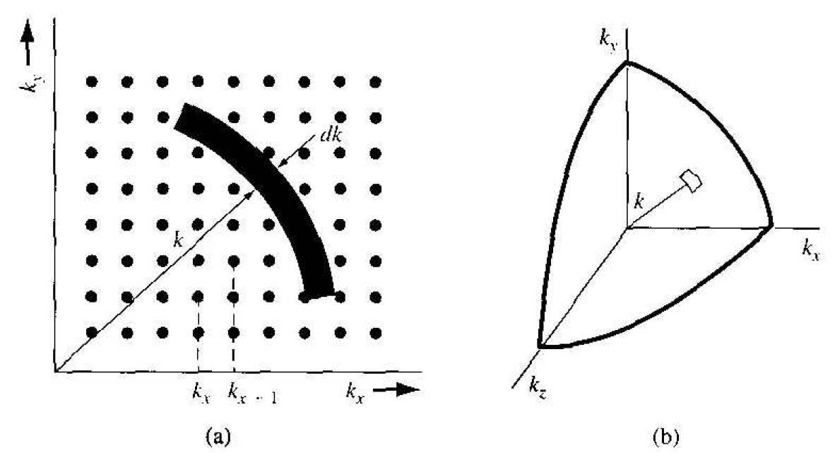 Figure 1.1 (a) A two-dimensional army of allowed quantum stales in k space. (b) The positive one-eighth of the spherical k space.