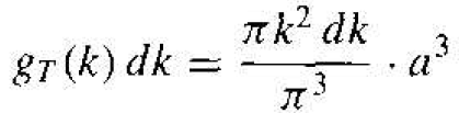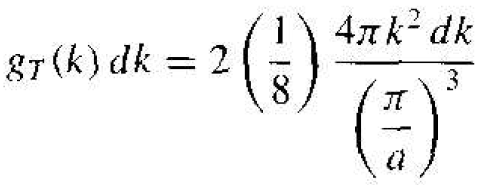 The first factor, 2, takes into account the two spin states allowed for each quantum stale; the next factor, 1/8, takes into account that we are considering only the quantum states for positive values of kx, ky, and kz. The factor 4πk2 dk, is again the differential volume and the factor (π/a)3 is the volume of one quantum state. Equation (5) may be simplified to