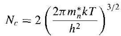 The parameter Nc is called the effective density of states function in the conduction band. If we were to assume that m*n = m0, then the value of the effective density of states function at T = 300 K is Nc = 2.5 × 10-19 cm-3, which is the order of magnitude of Nc for most semiconductors. If the effective mass of the electron is larger or smaller than m0, then the value of the effective density of states function changes accordingly, but is still of the same order of magnitude.