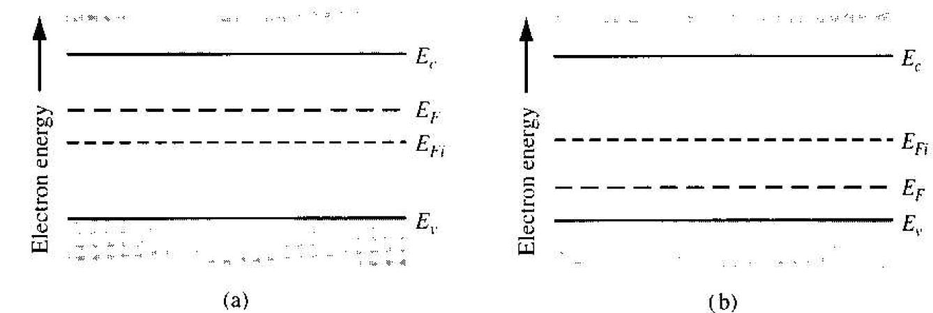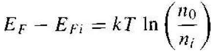 Equation (7) can be used to find the difference between the intrinsic Fermi level and the Fermi energy in terms of the acceptor concentration. The hole concentration p0 in Equation (7). We may again note from Equation (4) that, for an n-type semiconductor, n0 > ni and EF > EFi. The Fermi level for an n-type semiconductor is above EFi. For a p-type semiconductor, p0 > ni , and from Equation (7) we see that