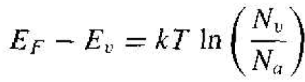 The distance between the Fermi level and the top of the valence-band energy for a p-type semiconductor is a logarithmic function or the acceptor concentration: as the acceptor concentration increases, the Fermi level moves closer to the valence band. Equation (6) still assumes that the Boltzmann approximation is valid. Again. if we have a compensated p-type semiconductor, then the Na term in Equation (6) is replaced by Na - Nd, or the net effective acceptor concentration.