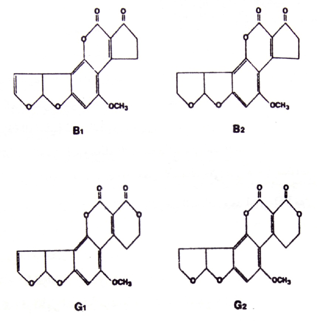 التركيب الكيماوي للأفلاتوكسينات , G2 , G1 , B2 ، B1 التي تنتجها فطريات اسبرجيلس فلافس