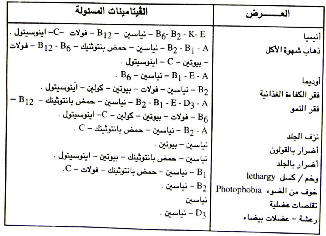 نقص البيريدوكسين في السالمون والتراوت والمبروك والقرموط والشلبة Bream له أعراض منها خفض محسوس في النمو والتحويل الغذائي واستهلاك العلف، واديما edema اضطراب الحركة ataxia ، تقرن العين وجحوظها exophthalmia ، حساسية للإثارة شديدة hyperirritability ، زعانف صريعة epiliptiform fins ، انيميا ، عوم شارد erratic أو حلزوني Spiral ، عدم قدرة القبض علي الغذاء ، تنفس سريع كاللهث gasping like، ثبات الغطاء الخيشومي ، نقصي نشاط انزيمات نقل مجاميع الأمين (جلوتامات اوكسال اسيتات ، جلوتامات بيروفات) ، وشدة النفوق . وربما تظهر أعراض النقص بسرعة ، غالبا في ظرف 4-6 أسابيع. نقص البيوتين في السالمون والتراوت والمبروك يظهر أعراضا منها انخفاض النمو والكفاءة الغذائية ، أنيميا مصاحبة لزيادة كرات الدم البيضاء وكرات الدم الحمراء غير الناضجة ، ضمور الخلايا العنقودية البنكرياسية Pancreatic acinar Cells ، ترسيبات تشبة الجليكوچين في الانابيب البولية ، امتداد الكبد و شحوب لونه enlarged pale liver ، انخفاض مستوي حمض دوكوسا بنتينويك dOCOSapentaenoic acid في الكبد ، انخفاض نشاط إنزيم اسيتيل كوانزيم العضلات ، تشنجات أضرار بالأمعاء الغليظة ونفوق. نقص حمض الفوليك في السالمون والتراوت والمبروك والقرموط أعراضه تشمل انخفاض النمو والتحويل الغذائي ، أنيميا متميزة من نوع عدم تجانس حجوم الخلايا وتشوهها anisocytosis and poikilocytosis ، شحوب لون الخياشيم ، اسوداد لون الجلد ، حالة سبات (نعاس) lethargy، نفوق . وتظهر أعراض النقص بعد فترة طويلة من التغذية ، عموما 15 اسبوعا او اكثر.