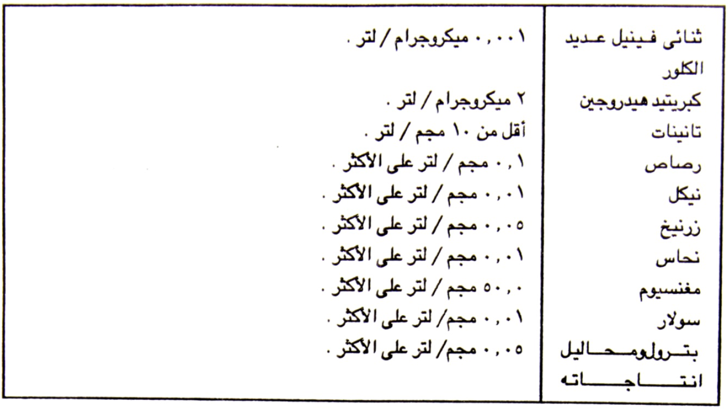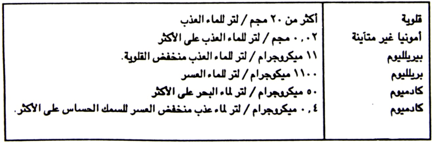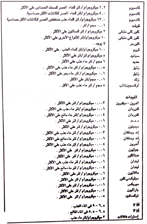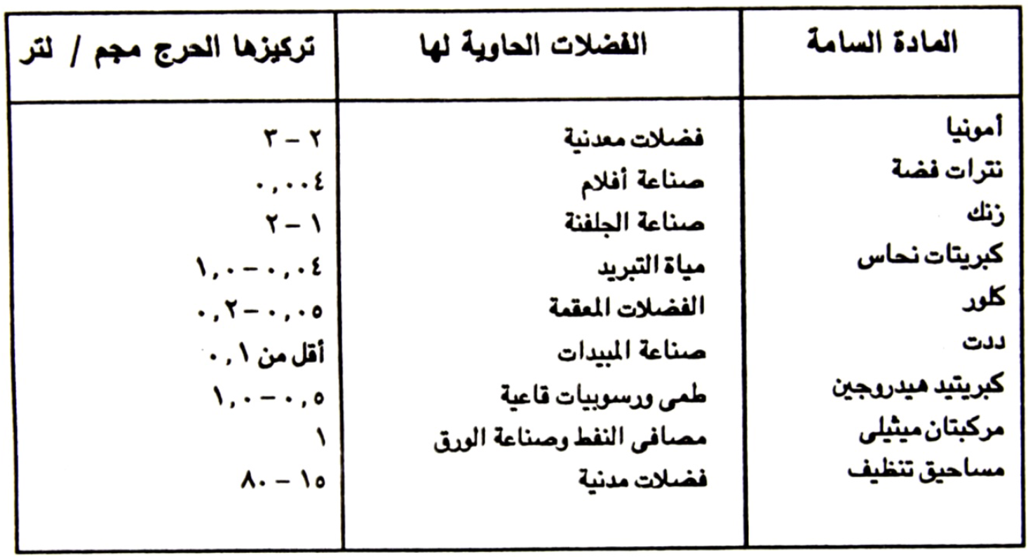 بعض السموم المألوفة والفضلات الحاوية لها وتركيزها الحرج في الماء: