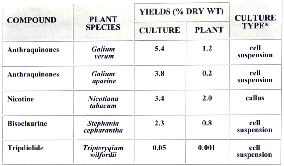 وعامة فان الخلايا النباتية تنتج كميات قليلة من المركبات الثانوية وان تقنيات الزراعة النسيجية تمكننا من انتخاب خلايا لها المقدرة العالية على انتاج المركبات الثانوية نظرا للاختلافات الوراثية الموجودة بين الخلايا في مزارع الانسجة ويمكن الاستفادة من هذه الطريقة لإنتاج الفينولات والقلويدات والاستيرويدات والفيتامينات ومكسبات الطعم والرائحة.