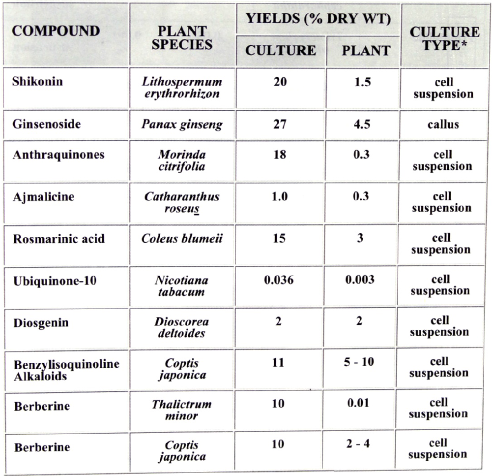 جدول يبين الانتاج العالي للمركبات الثانوية باستخدام زراعة الخلايا النباتية