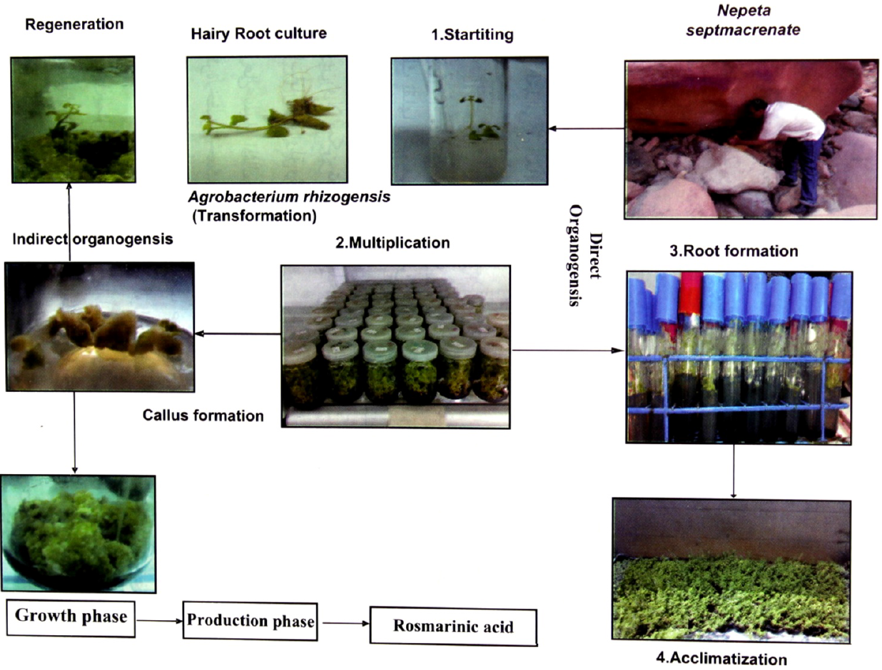 ولقد تمكن بعضي الباحثين من انتاج بعض المركبات المضادة للأكسدة مثل حامض الروزمارينيك (Lee et al 2008 and 2010, Maksoud,2007)وكما في مزارع انسجة نباتات الريحان واستطاعوا زيادة كمية المادة الفعالة الى اكثر من الضعف كما زادت المركبات المكونة للزيوت الطيارة من 34 مركب الى 41 مركبا عطريا ولدفع استخدام تقنية زراعة الانسجة والخلايا لإنتاج المركبات الثانوية يتطلب ايجاد نظام لزراعة الانسجة التي تضمن تخليق المركبات المرغوبة وبالتالي اختيار وانتخاب سلالات خلوية قادرة على الانتاج بدرجة عالية لهذه المركبات كما يتطلب تصميم المفاعلات الحيوية التي تساعد القدرة الوراثية والكيماوية الحيوية للخلايا لترفع قدرتها على الانتاج بمستويات عالية.