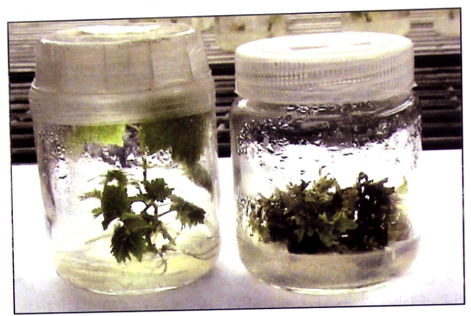 شكل يبين ظاهرة Vitrification في نبات العنب بالمقارنة بالنمو السليم