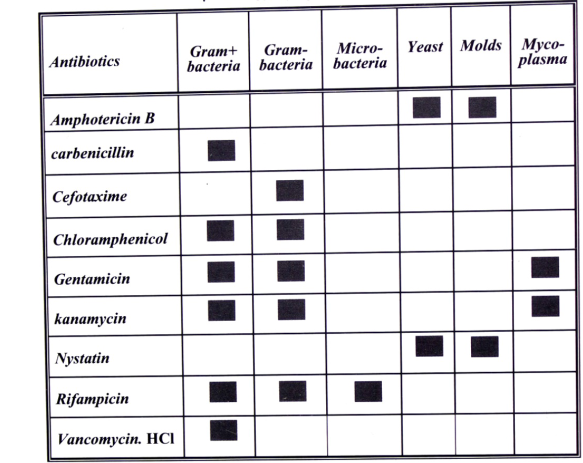 تضاف أحياناً إلى البيئة الغذائية بعض المضادات الحيوية (الجدول ادناه) لإيقاف نشاط الكائنات الدقيقة وأهمها البكتيريا الموجودة بالجزء النباتي المزروع, 2001) (Young et al,1984, O'Neilإلا أنه يجب الأخذ في الاعتبار أن هذه المركبات الكيماوية لها بعض الضرر لنمو الأجزاء النباتية وتكشفها ولذلك يفضل إضافتها فقط عند الضرورة كما أنه يجب أن يتم تعريف البكتيريا المسببة للتلوث قبل الشروع في اختيار المضاد الحيوي الملائم وأيضاً مراعاة التركيز الملائم لكل مركب حيوي وكما يحدث في حالة الاستخدام لفترة طويلة قد يتكون سلالات من البكتيريا تقاوم أنواع معينة من المضادات الحيوية.