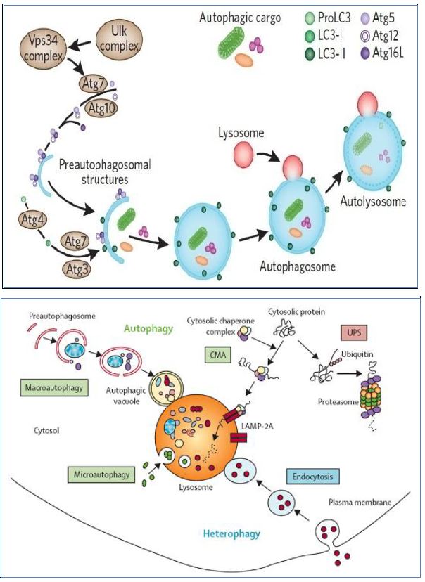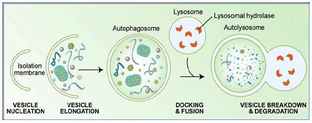 - Macroautophagy : تكوين تركيب ثنائي الطبقة Autophagosome الذي يقتنص المواد التالفة وتسليمها الى الاجسام الحالة لتقوم بتحليلها ، ويمكن ان تكون الاجسام الحالة متخصصة ببعض مكونات الخلية مثل المايتوكوندريا التالفة .