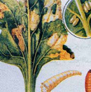 تظهر الإصابة بذبابة أوراق البنجر على هيئة أنفاق متداخلة في صورة بقع باهتة اللون ناتجة عن تلف مساحات كبيرة من أنسجة الأوراق الخضراء.